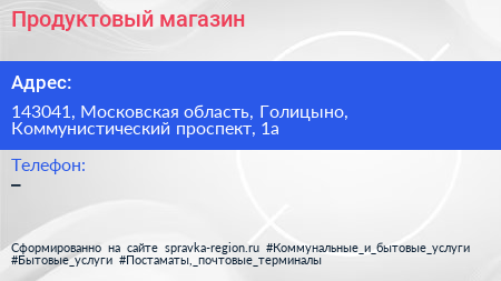 Продуктовый магазин по адресу 143041, Московская область, Голицыно, Коммунистический проспект, 1а в дальнейшем Организация, размещена в следующих категориях: