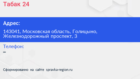 Табак 24 по адресу 143041, Московская область, Голицыно, Железнодорожный проспект, 3 в дальнейшем Организация, размещена в следующих категориях: