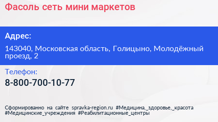 Фасоль, сеть мини-маркетов по адресу 143040, Московская область, Голицыно, Молодёжный проезд, 2 в дальнейшем Организация, размещена в следующих категориях: