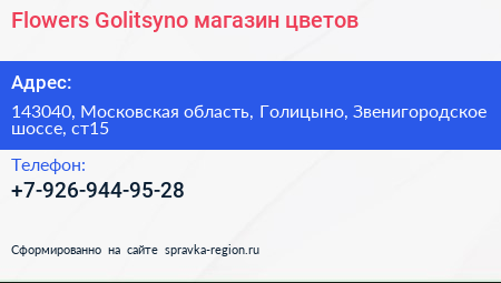 Flowers Golitsyno, магазин цветов по адресу 143040, Московская область, Голицыно, Звенигородское шоссе, ст15 в дальнейшем Организация, размещена в следующих категориях: