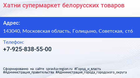 Хатни, супермаркет белорусских товаров по адресу 143040, Московская область, Голицыно, Советская, ст6 в дальнейшем Организация, размещена в следующих категориях: