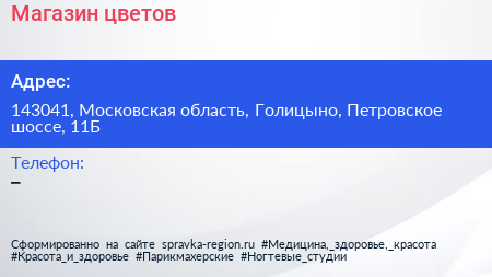 Магазин цветов по адресу 143041, Московская область, Голицыно, Петровское шоссе, 11Б в дальнейшем Организация, размещена в следующих категориях:
