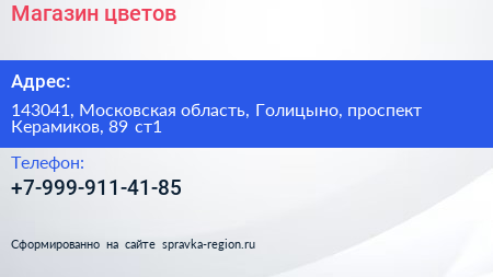 Магазин цветов по адресу 143041, Московская область, Голицыно, проспект Керамиков, 89 ст1 в дальнейшем Организация, размещена в следующих категориях: