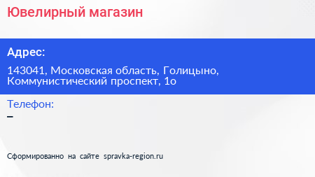 Ювелирный магазин по адресу 143041, Московская область, Голицыно, Коммунистический проспект, 1о в дальнейшем Организация, размещена в следующих категориях: