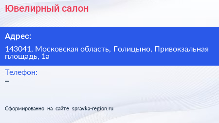 Ювелирный салон по адресу 143041, Московская область, Голицыно, Привокзальная площадь, 1а в дальнейшем Организация, размещена в следующих категориях: