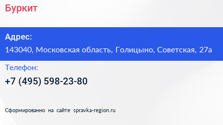 Буркит по адресу 143040, Московская область, Голицыно, Советская, 27а в дальнейшем Организация, размещена в следующих категориях: