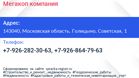 Мегакоп, компания по адресу 143040, Московская область, Голицыно, Советская, 1 в дальнейшем Организация, размещена в следующих категориях: