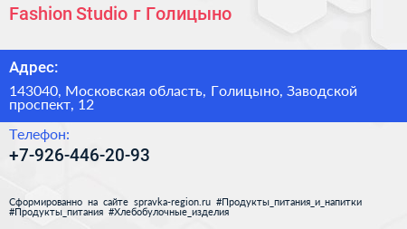 Fashion Studio, г. Голицыно по адресу 143040, Московская область, Голицыно, Заводской проспект, 12 в дальнейшем Организация, размещена в следующих категориях:
