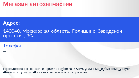 Магазин автозапчастей по адресу 143040, Московская область, Голицыно, Заводской проспект, 30а в дальнейшем Организация, размещена в следующих категориях: