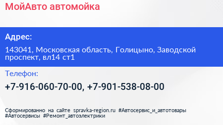 МойАвто, автомойка по адресу 143041, Московская область, Голицыно, Заводской проспект, вл14 ст1 в дальнейшем Организация, размещена в следующих категориях: