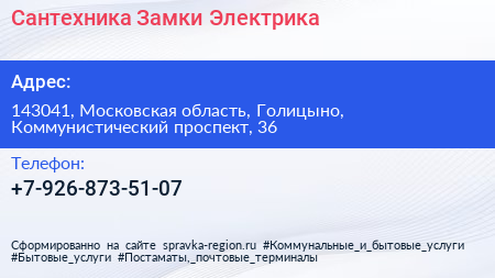 Сантехника Замки Электрика по адресу 143041, Московская область, Голицыно, Коммунистический проспект, 36 в дальнейшем Организация, размещена в следующих категориях: