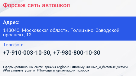 Форсаж, сеть автошкол по адресу 143040, Московская область, Голицыно, Заводской проспект, 12 в дальнейшем Организация, размещена в следующих категориях:
