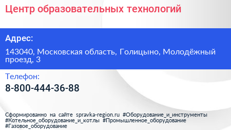 Центр образовательных технологий по адресу 143040, Московская область, Голицыно, Молодёжный проезд, 3 в дальнейшем Организация, размещена в следующих категориях: