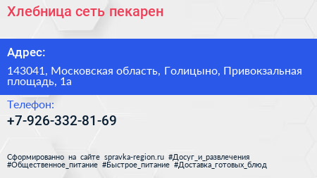 Хлебница, сеть пекарен по адресу 143041, Московская область, Голицыно, Привокзальная площадь, 1а в дальнейшем Организация, размещена в следующих категориях: