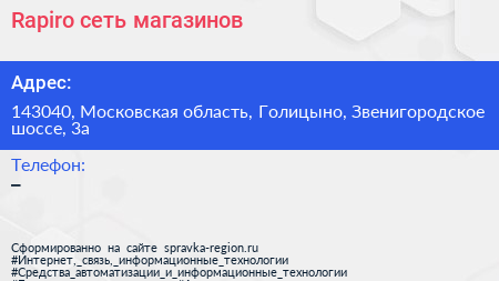 Rapiro, сеть магазинов по адресу 143040, Московская область, Голицыно, Звенигородское шоссе, 3а в дальнейшем Организация, размещена в следующих категориях: