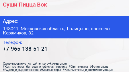 Суши-Пицца-Вок по адресу 143041, Московская область, Голицыно, проспект Керамиков, 82 в дальнейшем Организация, размещена в следующих категориях: