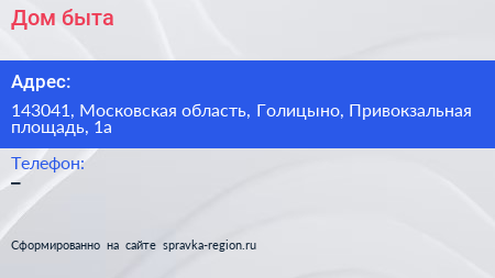 Дом быта по адресу 143041, Московская область, Голицыно, Привокзальная площадь, 1а в дальнейшем Организация, размещена в следующих категориях: