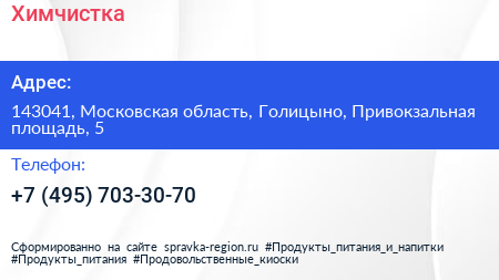 Химчистка по адресу 143041, Московская область, Голицыно, Привокзальная площадь, 5 в дальнейшем Организация, размещена в следующих категориях: