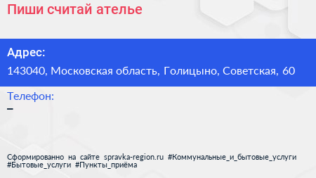 Пиши-считай, ателье по адресу 143040, Московская область, Голицыно, Советская, 60 в дальнейшем Организация, размещена в следующих категориях: