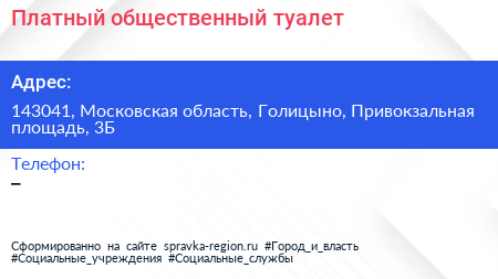 Платный общественный туалет по адресу 143041, Московская область, Голицыно, Привокзальная площадь, 3Б в дальнейшем Организация, размещена в следующих категориях: