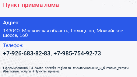 Пункт приема лома по адресу 143040, Московская область, Голицыно, Можайское шоссе, 160 в дальнейшем Организация, размещена в следующих категориях: