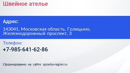 Швейное ателье по адресу 143041, Московская область, Голицыно, Железнодорожный проспект, 3 в дальнейшем Организация, размещена в следующих категориях: