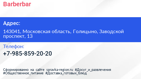 Barberbar по адресу 143041, Московская область, Голицыно, Заводской проспект, 13 в дальнейшем Организация, размещена в следующих категориях: