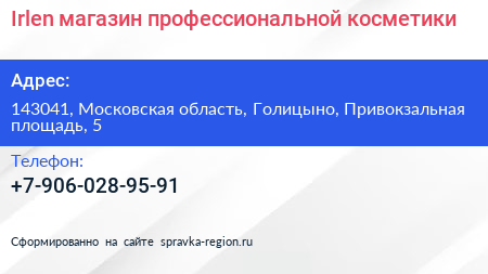 Irlen, магазин профессиональной косметики по адресу 143041, Московская область, Голицыно, Привокзальная площадь, 5 в дальнейшем Организация, размещена в следующих категориях: