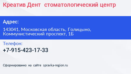 Креатив Дент+, стоматологический центр по адресу 143041, Московская область, Голицыно, Коммунистический проспект, 1Б в дальнейшем Организация, размещена в следующих категориях: