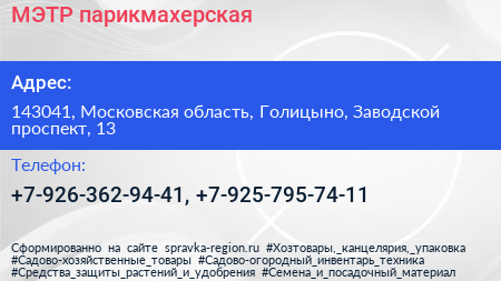 МЭТР, парикмахерская по адресу 143041, Московская область, Голицыно, Заводской проспект, 13 в дальнейшем Организация, размещена в следующих категориях: