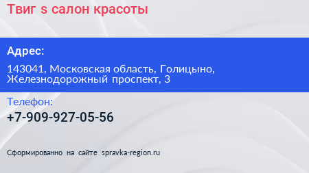 Твиг`s, салон красоты по адресу 143041, Московская область, Голицыно, Железнодорожный проспект, 3 в дальнейшем Организация, размещена в следующих категориях:
