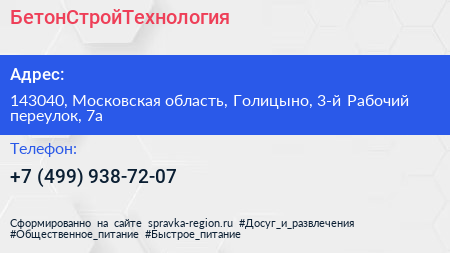 БетонСтройТехнология по адресу 143040, Московская область, Голицыно, 3-й Рабочий переулок, 7а в дальнейшем Организация, размещена в следующих категориях: