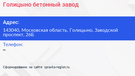 Голицыно, бетонный завод по адресу 143040, Московская область, Голицыно, Заводской проспект, 26Б в дальнейшем Организация, размещена в следующих категориях: