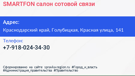 SMARTFON, салон сотовой связи по адресу Краснодарский край, Голубицкая, Красная улица, 141 в дальнейшем Организация, размещена в следующих категориях:
