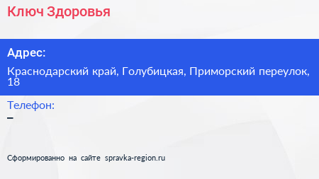 Ключ Здоровья по адресу Краснодарский край, Голубицкая, Приморский переулок, 18 в дальнейшем Организация, размещена в следующих категориях: