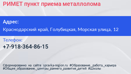 РИМЕТ, пункт приема металлолома по адресу Краснодарский край, Голубицкая, Морская улица, 12 в дальнейшем Организация, размещена в следующих категориях: