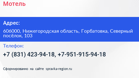 Мотель по адресу 606000, Нижегородская область, Горбатовка, Северный посёлок, 103 в дальнейшем Организация, размещена в следующих категориях: