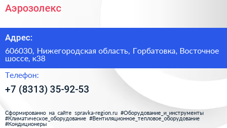 Аэрозолекс по адресу 606030, Нижегородская область, Горбатовка, Восточное шоссе, к38 в дальнейшем Организация, размещена в следующих категориях: