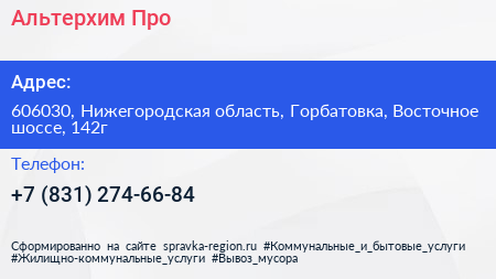 Альтерхим-Про по адресу 606030, Нижегородская область, Горбатовка, Восточное шоссе, 142г в дальнейшем Организация, размещена в следующих категориях: