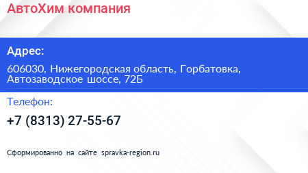 АвтоХим, компания по адресу 606030, Нижегородская область, Горбатовка, Автозаводское шоссе, 72Б в дальнейшем Организация, размещена в следующих категориях:
