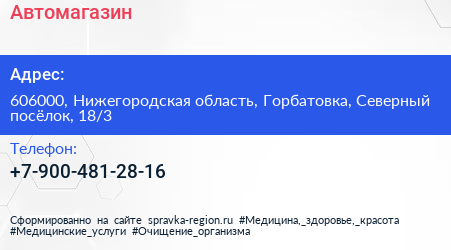 Автомагазин по адресу 606000, Нижегородская область, Горбатовка, Северный посёлок, 18/3 в дальнейшем Организация, размещена в следующих категориях: