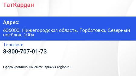 ТатКардан по адресу 606000, Нижегородская область, Горбатовка, Северный посёлок, 100а в дальнейшем Организация, размещена в следующих категориях: