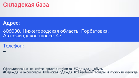 Складская база по адресу 606030, Нижегородская область, Горбатовка, Автозаводское шоссе, 47 в дальнейшем Организация, размещена в следующих категориях:
