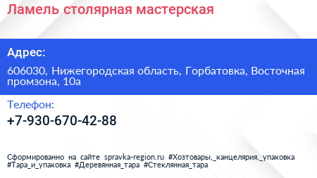 Ламель, столярная мастерская по адресу 606030, Нижегородская область, Горбатовка, Восточная промзона, 10а в дальнейшем Организация, размещена в следующих категориях: