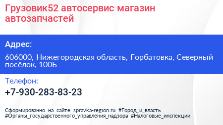 Грузовик52, автосервис-магазин автозапчастей по адресу 606000, Нижегородская область, Горбатовка, Северный посёлок, 100Б в дальнейшем Организация, размещена в следующих категориях: