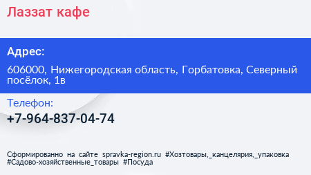 Лаззат, кафе по адресу 606000, Нижегородская область, Горбатовка, Северный посёлок, 1в в дальнейшем Организация, размещена в следующих категориях: