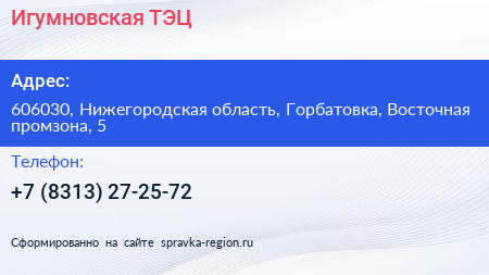 Игумновская ТЭЦ по адресу 606030, Нижегородская область, Горбатовка, Восточная промзона, 5 в дальнейшем Организация, размещена в следующих категориях: