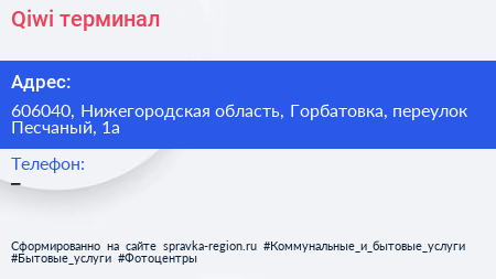 Qiwi, терминал по адресу 606040, Нижегородская область, Горбатовка, переулок Песчаный, 1а в дальнейшем Организация, размещена в следующих категориях: