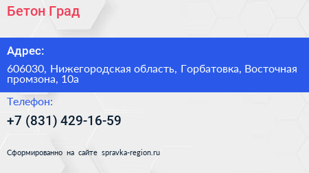 Бетон-Град по адресу 606030, Нижегородская область, Горбатовка, Восточная промзона, 10а в дальнейшем Организация, размещена в следующих категориях: