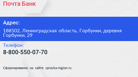 Почта Банк по адресу 188502, Ленинградская область, Горбунки, деревня Горбунки, 29 в дальнейшем Организация, размещена в следующих категориях: